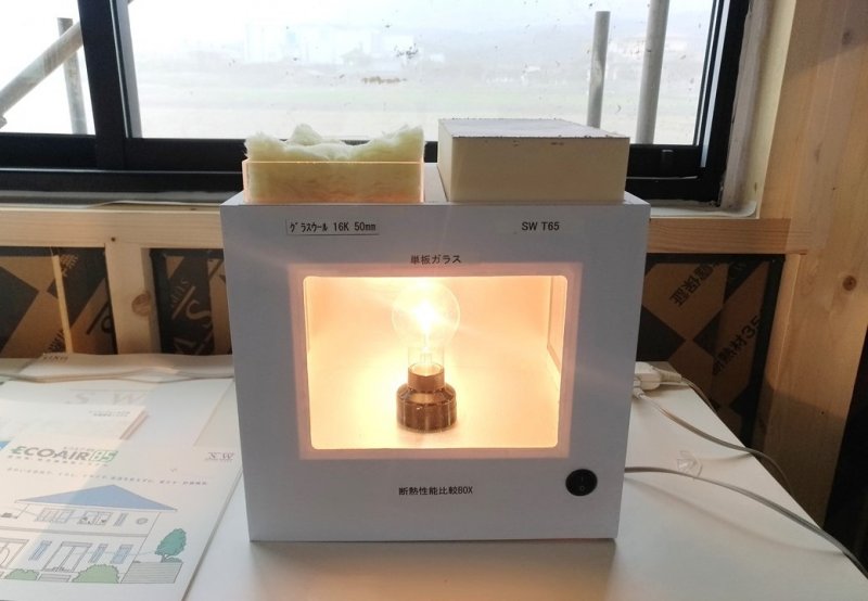 スーパーウォールパネルとグラスウール、ペアガラスと単板ガラスの熱の伝わり方の違いを実際に体感していただきました。