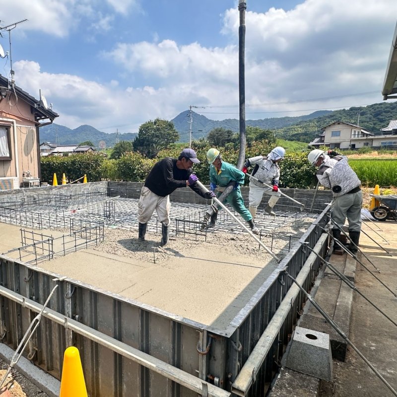自然素材の家:2024年08月10日 自然素材の家 丸亀市H様邸 自然素材の家新築工事②【基礎コンクリート打設工事】 毎日37℃を超える暑い中、自然素材の家新築工事の基礎工事が始まりました。 先日も書きましたが、家を支える土台です。 ずっとずっと、この先何年も家を支えていくので、この工事は本当に大切な工事です。 先日、基礎鉄筋工事が終わり、その鉄筋にコンクリートを流しこんでいくのです。 職人さんはそれをキレイにならします。 さすが職人さんです!! とてもキレイですよね。 家ができると絶対見ることのないところですが、そんな場所にも手を抜かないのが職人技です! これで数日乾かす予定です!!
