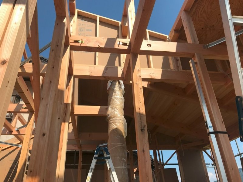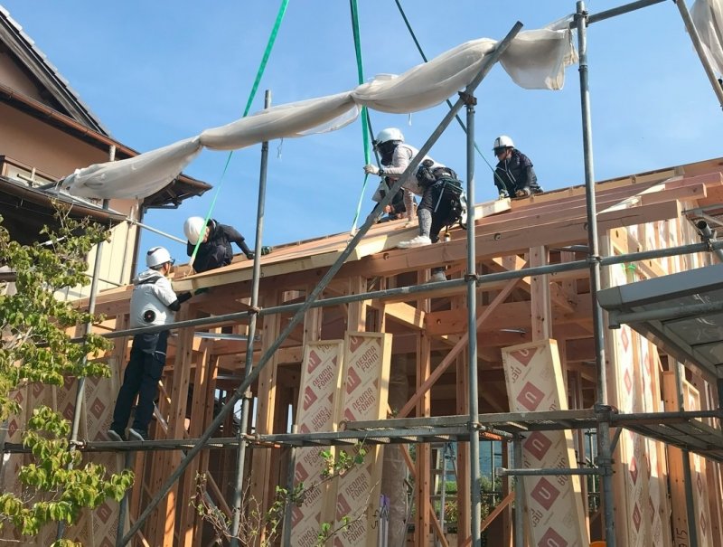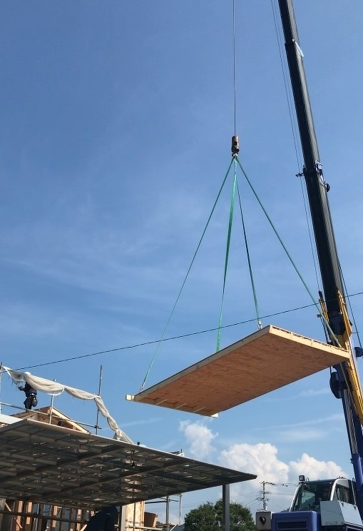 自然素材の家:2024年09月06日 自然素材の家 丸亀市H様邸 自然素材の家新築工事④【上棟】 本日は「上棟」工事です。 土台を2日前につくったばかりですが、上棟工事で、ほとんど家のカタチができてしまうので、驚きです。 クレーンでつっているのは、屋根材です。 大工さんによって、吊った屋根材を固定しています。 暑い中、本当に大変な作業です。 自然素材をつかった「家」が出来てきましたね。 これからの工事も楽しみです。