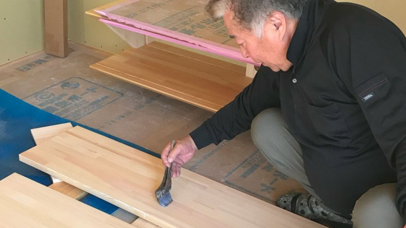 今回のお家は、たくさん棚があるため、たくさんの木材にクリアを塗っています。