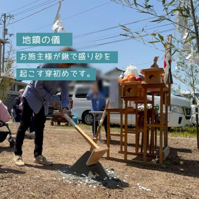 地鎮祭とは、住宅建築の新築工事を始める前に、その土地の神様を鎮め、挨拶し、土地を利用させてもらうことの許しを得る儀式です。わたしたちも、ステキなマイホームをお祈りしました。
