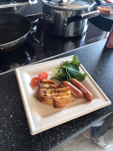 目の前のフライパンでフレンチトーストが出来上がりました!!