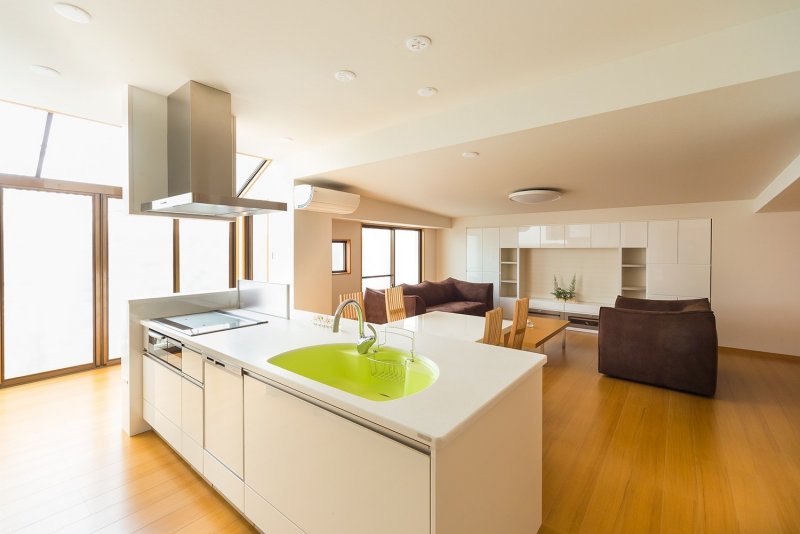 23帖あるLDK、北面一面にW3600あるTVボードを据付け、広々とした空間に仕上げました。