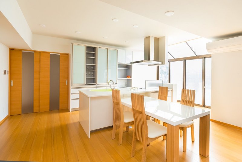 アイランドキッチン、収納たっぷりの背面収納、W3600あるTVボード、リビング横にも収納庫を設け、扇風機などを収納できるようにしました。
