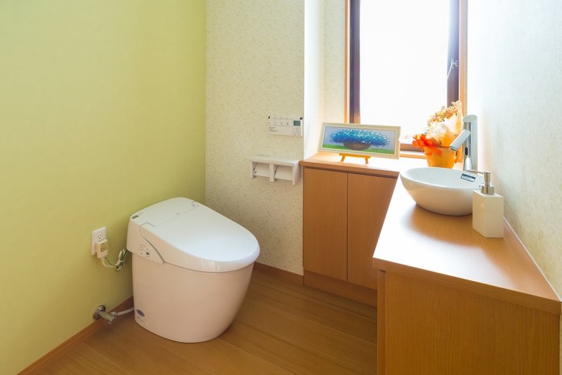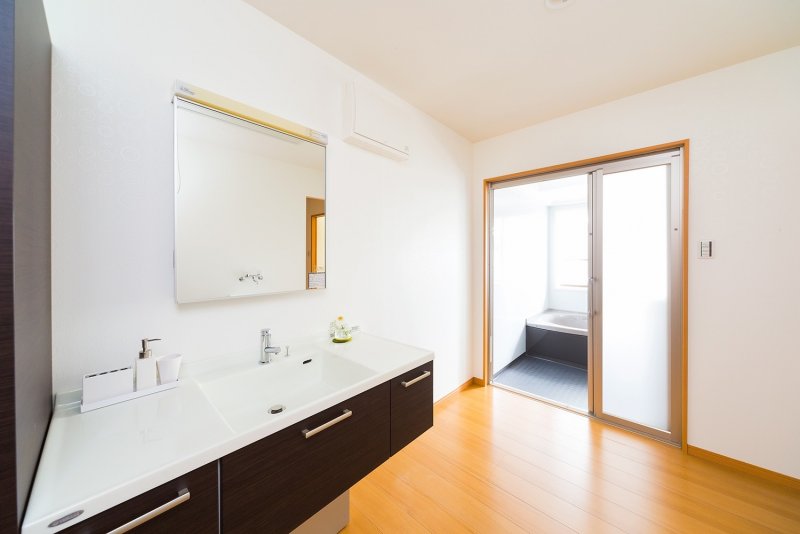 洗面室も3帖ほどあり洗濯物が干せるようにしてあります。浴室も1.25坪ほどありTV付で快適です。トイレは以前浴室だった場所に配置し、製作カウンターを取付けたことで大収納に生まれ変わりました。