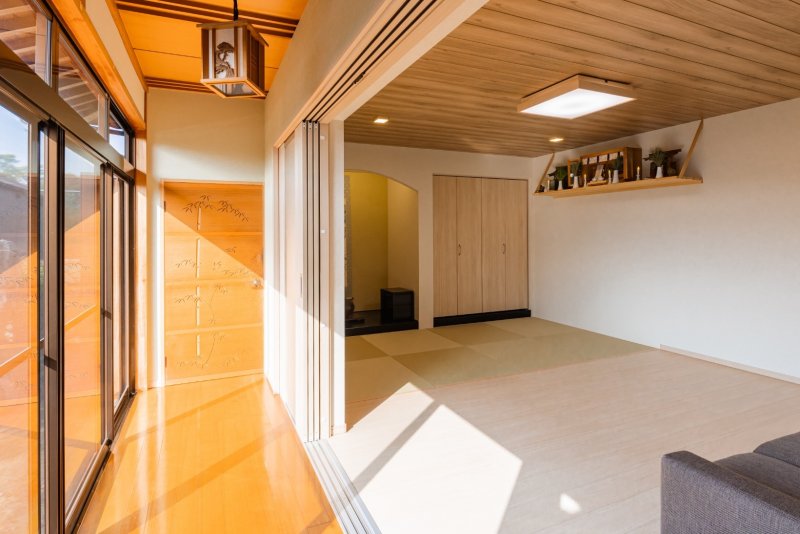 床の間と仏間のあるこちらの部屋は天井は羽目板仕上げ、床はフローリングと畳を貼り分け、まさに和洋折衷の「新和風」。