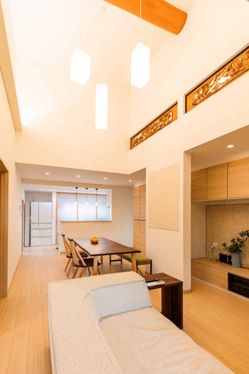 梁をまたいで専用のペンダントライトを大きさや設置高に変化を加えて取り付け、既存の欄間を移設し、間接照明にリメイクしました。