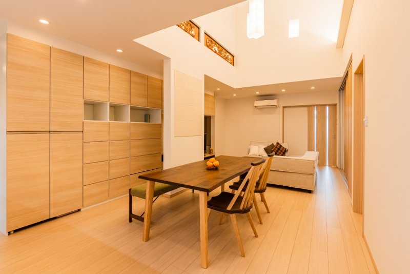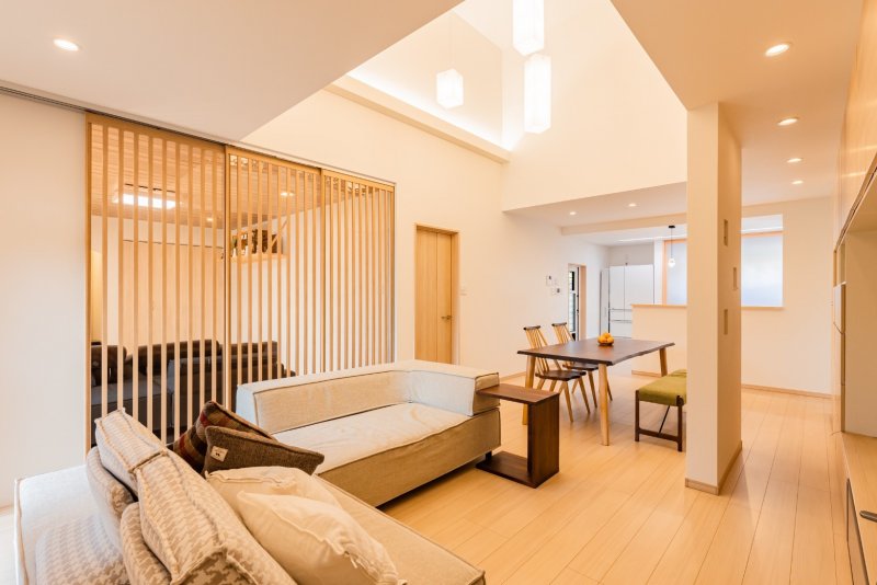 たくさんの仲間が集まるリビングは、和室2室と廊下を取り込み広々としたスペース。