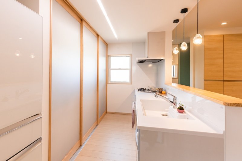 開口幅を大きくとれる3枚式の引戸を開ければリビングと繋がり開放感のある空間に。