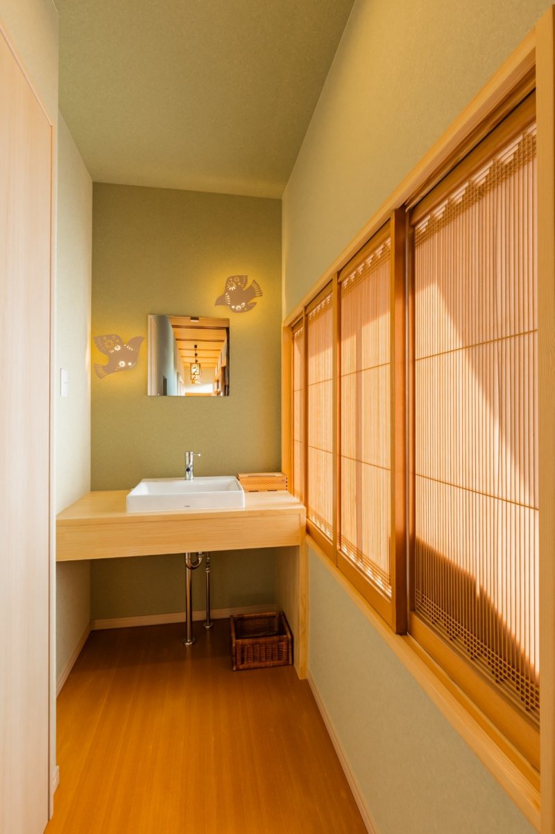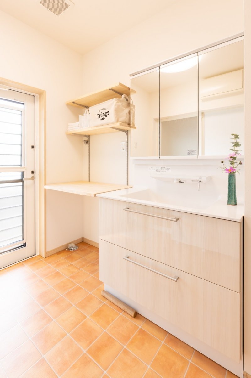 洗面所はナチュラルで温かみのあるテラコッタ柄のクッションフロア。