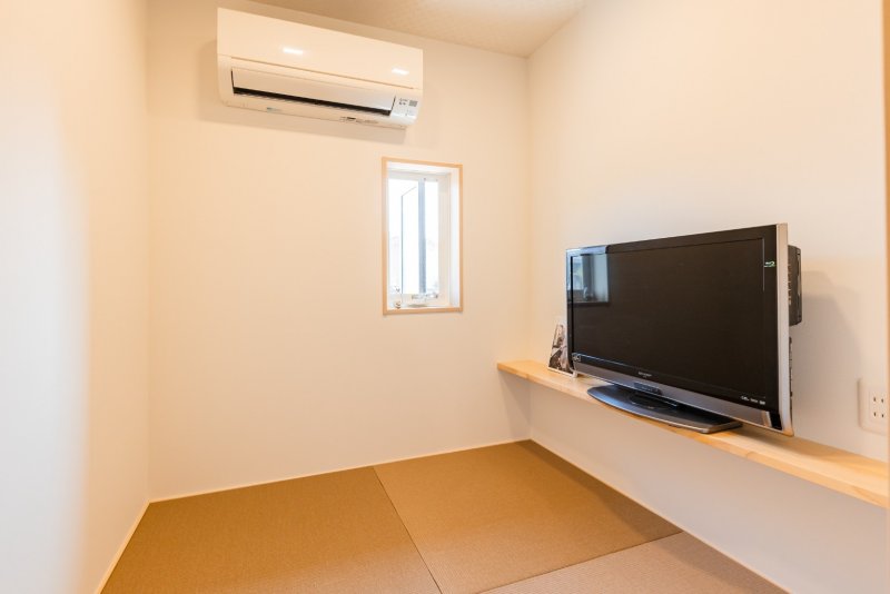 壁一面を使ったテレビボードは床材と同じ色でコーディネートしました。