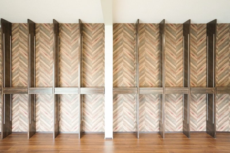 本棚の後ろの壁紙は、大好きなヘリンボーン柄に。
