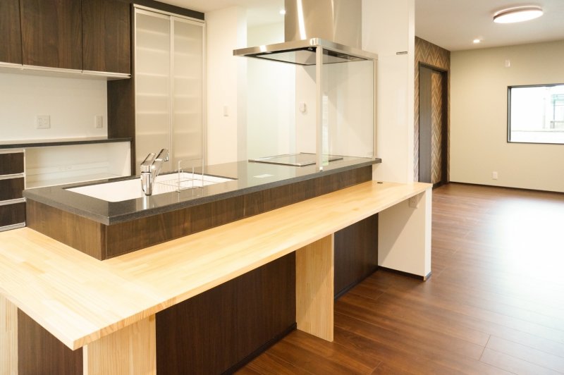 南北に明かりと風が抜ける空間にし、対面キッチン前にはダイニングテーブルを造作し、食事ができるまでの間、楽しく待てる時間に。