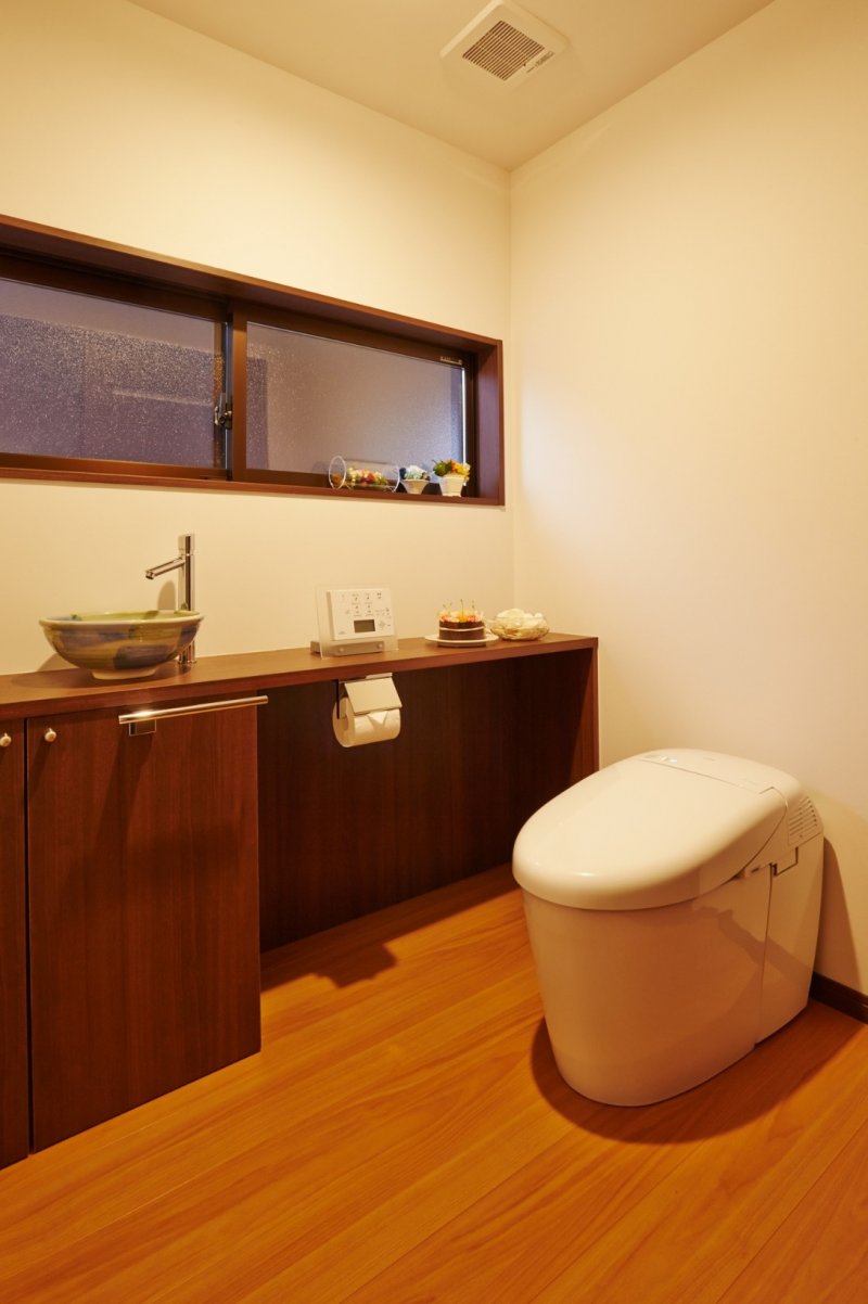 本を読みたいとのご要望に応えるべく、広く作ったトイレにはカウンターを造作し本がたくさん置けるスペースを作りました。