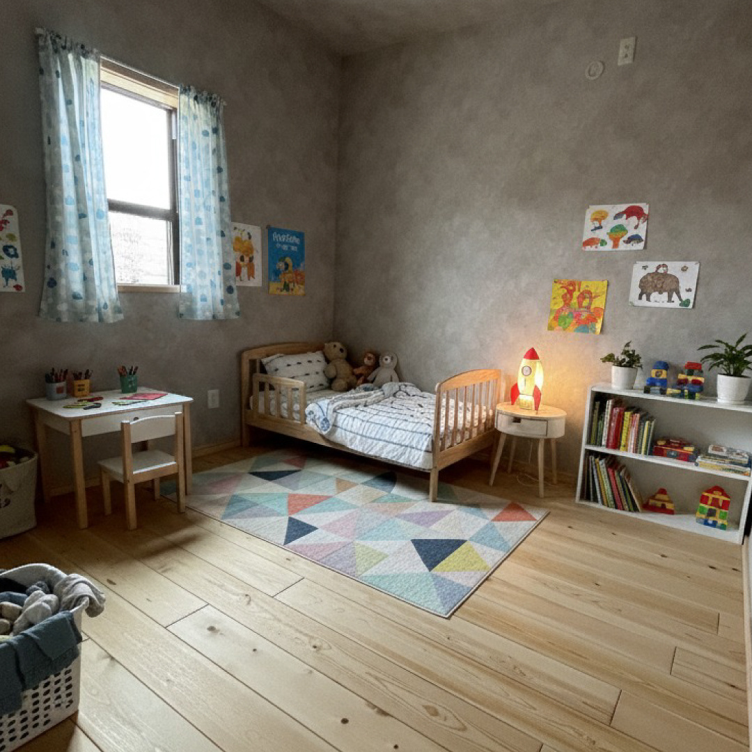 まずご紹介するのは、グレーの壁紙に包まれた部屋。子ども部屋としてアレンジしています。