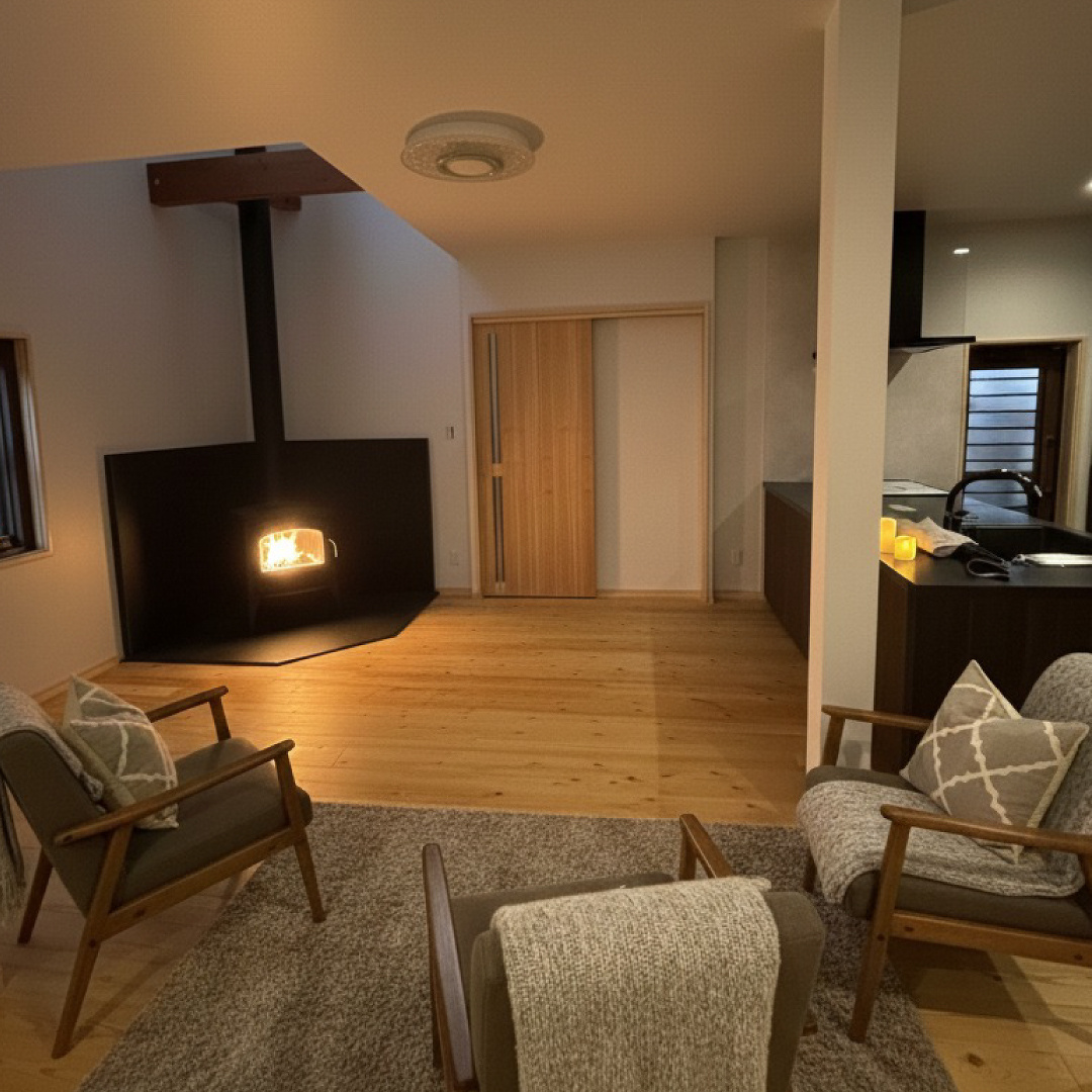 リビングには薪ストーブ。自然と家族の集まる空間に。