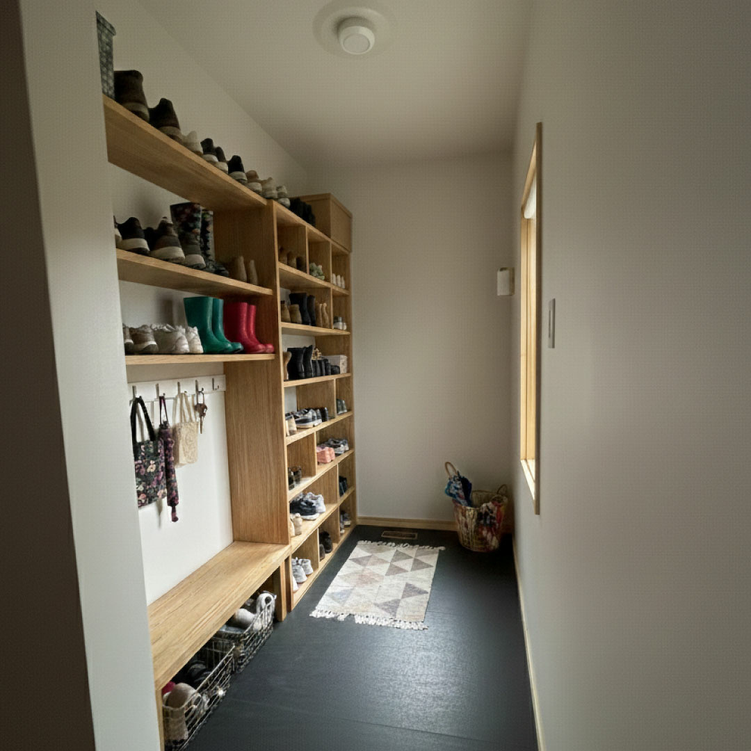 家族みんなの靴や外出に必要なアイテムをすっきり収納できるスペースにアレンジしました。