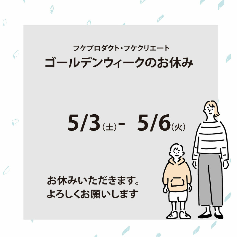 :2025年04月28日 GWのお休みについて さて、フケプロダクト・フケクリエートは 2025年5月3日(土)〜2025年5月6日(火)を GW休暇とさせていただきます。 ご不便をおかけしますが 何卒ご了承の程よろしくお願い致します