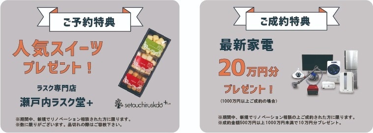 キャンペーン期間中にご相談いただき、ご成約された方には豪華成約特典をご用意しております。