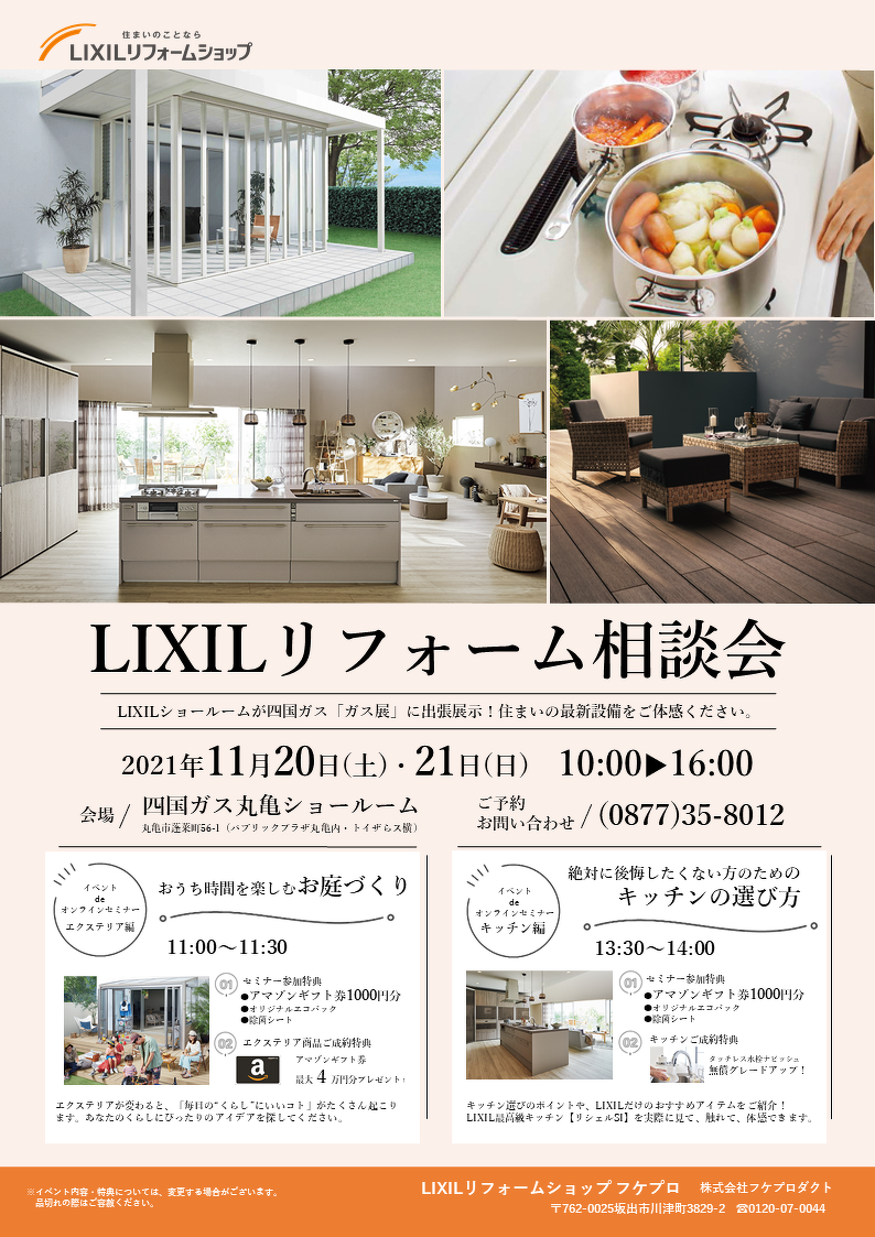 イベント:2021年10月21日 event <終了しました>LIXILリフォーム相談会in四国ガス丸亀ショールーム LIXILリフォーム相談会in四国ガス丸亀ショールーム LIXILショールームが四国ガス「ガス展」に出張展示! 住まいの最新設備をご体感ください。 2021年11月20(土)・21日(日) 10:00~16:00 会場:四国ガス丸亀ショールーム(丸亀市蓬莱町56-1 パブリックプラザ丸亀内)