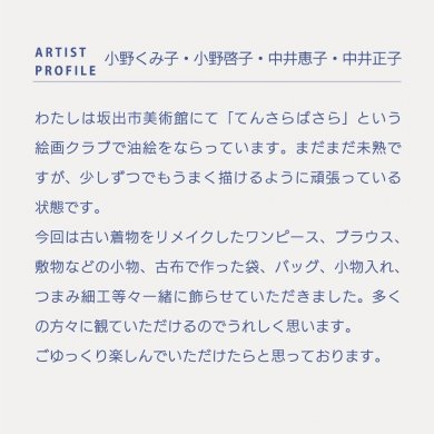 イベント:2023年05月30日 event 【6月のギャラリー】それぞれの作家による「4人展」 2023年6月、ギャラリーFUKEでは「それぞれの作家による 4人展」を開催します。 油絵、ワンピース、カバン、つまみ細工等、作家さんたちの個性がつまった作品ばかり。 開催期間:6月3日~30日 9:00~17:00 場所:フケプロダクト内ギャラリー 観覧無料 ARTIST PROFILE とても素敵な作品ばかりですので、是非散歩がてら見に来ませんか?