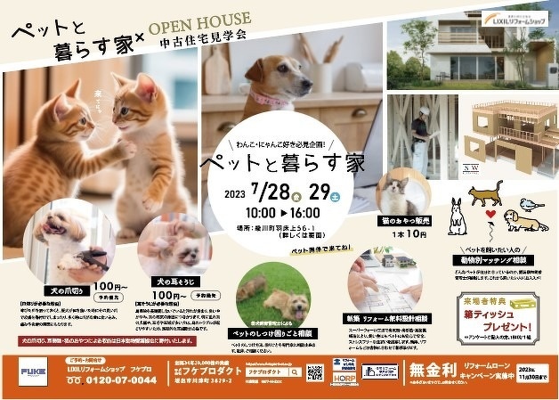 内容:犬の爪切り(100円~)予約優先、犬の耳掃除(100円~)予約優先、猫のおやつ(1本10円)、ペットのしつけ困りごと相談、ペットを飼いたい人の動物別マッチング相談、新築・リフォーム無料設計相談