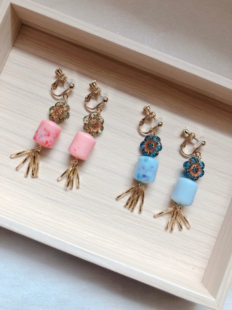 コットンパールやビンテージビーズ、ボタンで作ったアクセサリー。