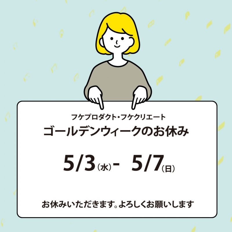 お知らせ:2023年04月21日 information GW休業のお知らせ こんにちは いつもありがとうございます。 さて、フケプロダクト、フケクリエートのゴールデンウィークのお休みは 5月3日~7日となります。 よろしくお願いいたします。