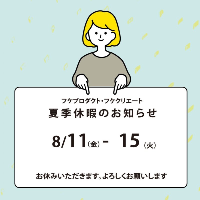 お知らせ:2023年08月04日 information 2023年夏季休暇のお知らせ こんにちは いつもありがとうございます。 暑い日がつづいています~。 みなさん、熱中症には十分気を付けてくださいね。 さて、フケプロダクトの夏季休暇は 8月11日~15日となります。 よろしくお願いいたします。