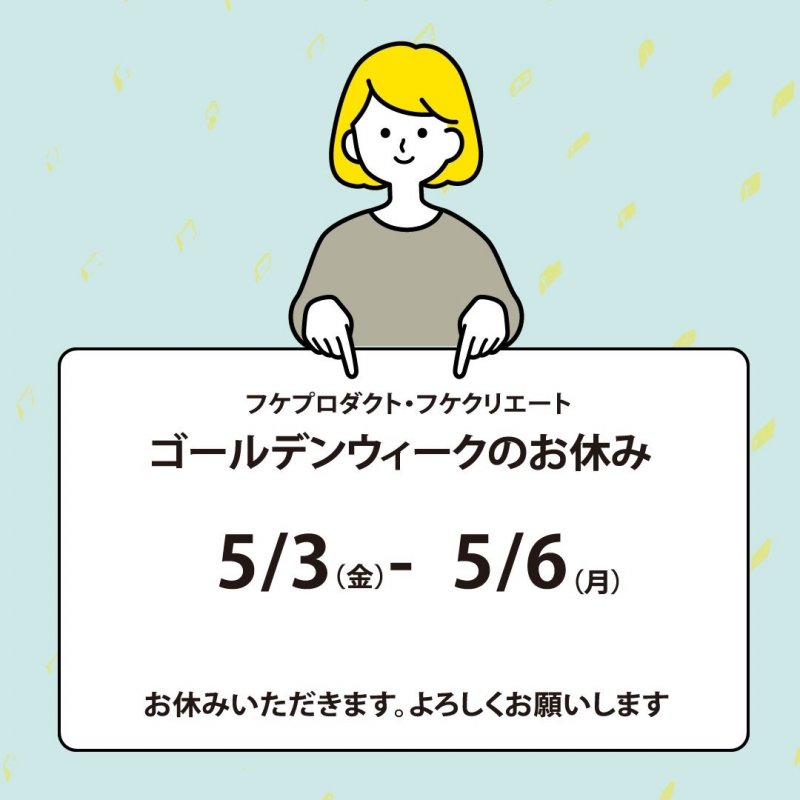 お知らせ:2024年04月15日 information 2024年ゴールデンウイーク休みのお知らせ 春がやってきました。 先週はお花見に聖通寺山に行ってきました。 桜も満開で、お花見日和でした。 さて、フケプロダクト、フケクリエートは 5/3~5/6までGW休暇をいただきますのでよろしくお願いいたします。