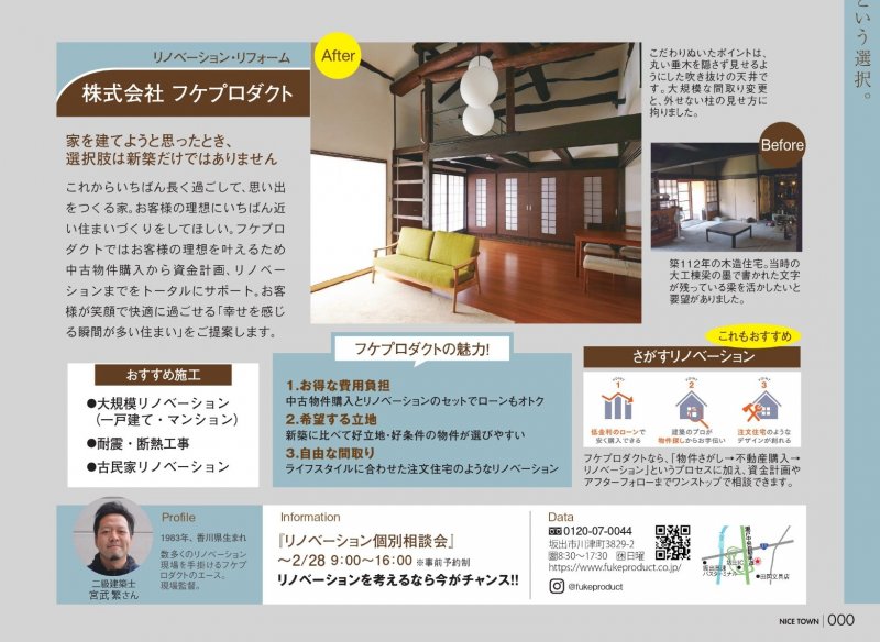 マスコミ掲載情報:2021年02月20日 media NICE TOWN3月号 NICE TOWN3月号「みちがえる。よみがえる。わがままリフォーム・リノベーション叶えます!」特集P183にフケプロダクトが掲載されています。 ぜひご覧ください。